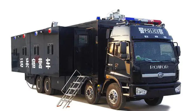 宿營(yíng)車是為滿足特殊環(huán)境下野外執(zhí)行任務(wù)、提高后勤保障能力研制開(kāi)發(fā)的專用車輛。由越野型二類底盤(pán)加裝大板式方艙組成,方艙通過(guò)液壓系統(tǒng)傳動(dòng)、電氣系統(tǒng)控制實(shí)現(xiàn)左右兩側(cè)自動(dòng)擴(kuò)展。車輛配有空調(diào)和燃油暖風(fēng)機(jī),可保證方艙內(nèi)的溫度恒定在人體最適合的溫度。車內(nèi)具有能同時(shí)滿足32人的住宿空間,集住宿、運(yùn)輸及影視娛樂(lè)為一體,滿足公安、部隊(duì)處理突發(fā)性任務(wù)的快速機(jī)動(dòng)需要。具有功能齊全、性能優(yōu)良、操作簡(jiǎn)便、保障能力強(qiáng)、適應(yīng)性廣等特點(diǎn)。