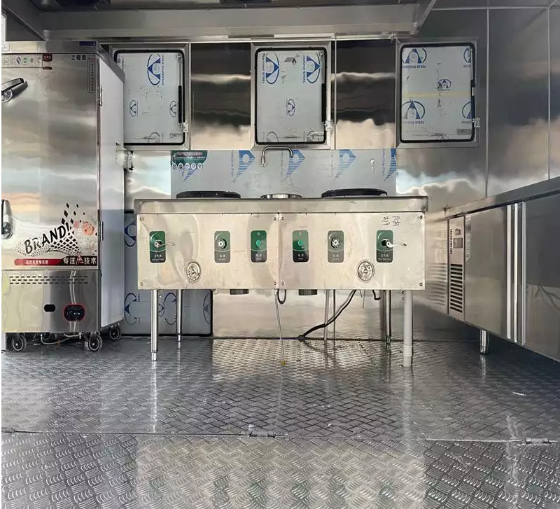 4)配電系統(tǒng):餐車的設(shè)備很多,灶具及蒸箱,冰箱冰柜,熱水器、車體電瓶充電系統(tǒng)等配套設(shè)備,作業(yè)的電力需求大,餐車根據(jù)不同設(shè)備功率配有獨(dú)立的配電箱,配有專門的市電接入口,也可選配柴油發(fā)電機(jī)組。