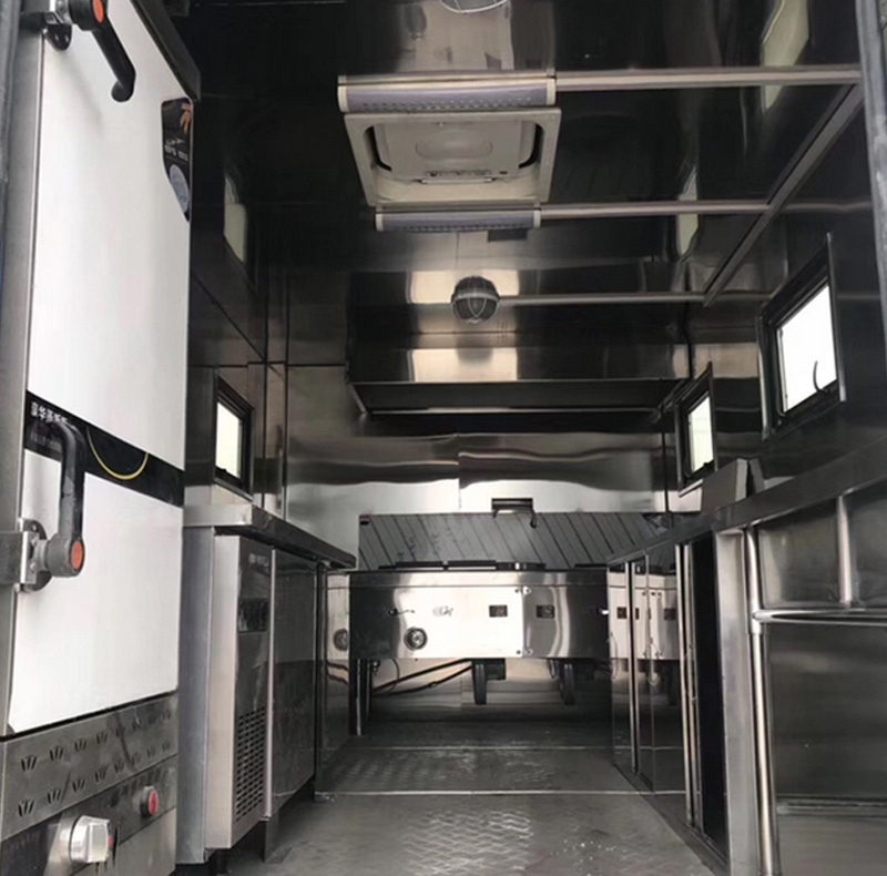 餐車裝備有主食灶,冷凍柜,炒菜灶,蒸飯?jiān)O(shè)備,燉菜灶,抽油煙機(jī),凈水儲(chǔ)水設(shè)備等廚房煮飯?jiān)O(shè)備,用于野外炊事使用。側(cè)面為裙邊結(jié)構(gòu),后部防護(hù)焊接連接, 結(jié)合保障餐車實(shí)際情況,車內(nèi)分為煮食區(qū)、洗滌區(qū),切菜區(qū),蒸飯區(qū),冷凍冰柜,車輛箱體中部為烹飪區(qū),可以容納兩名廚師作業(yè);適宜野外作業(yè),適應(yīng)各種特殊環(huán)境,普通公路,崎嶇山路,泥沙路燈。