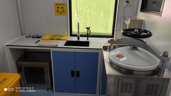 除了各實驗室的紫外線消毒車外,顯浩PCR實驗室設有一個專門的消殺區(qū),該區(qū)域配有一臺高壓滅菌鍋,可以對實驗器材,個人物品等進行高壓殺菌滅毒。